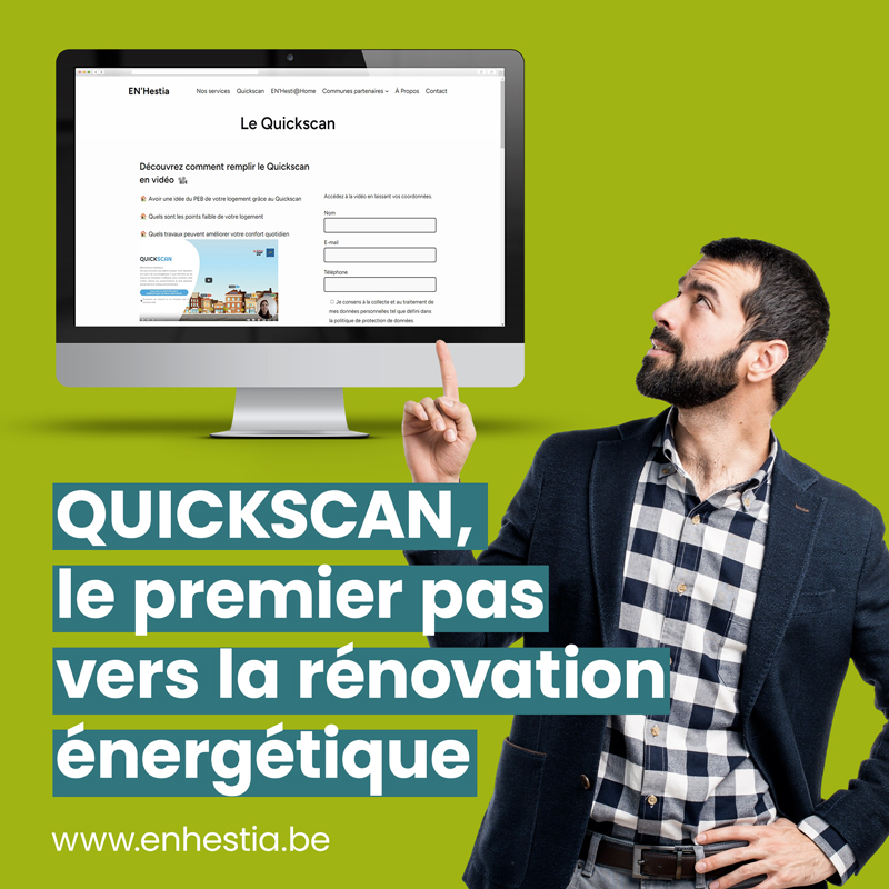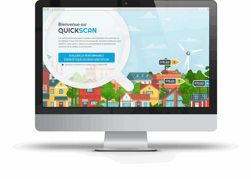 Le Quickscan est un outil en ligne simple et gratuit qui permet d’évaluer la performance énergétique d’un logement en quelques minutes. En répondant à une série de questions sur le bâtiment (isolation, système de chauffage, ventilation, production d’eau chaude, etc.), l’utilisateur obtient une première estimation de la classe énergétique et des principales pistes d’amélioration possibles.
